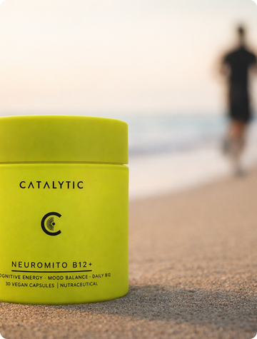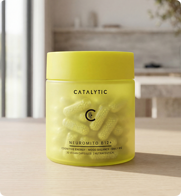 NeuroMito B12+ supports your brain’s natural “calm-focus” chemistry by pairing P5P (active B6)— the cofactor that helps make serotonin, dopamine, GABA, and norepinephrine—with bioactive B12 (methylcobalamin) and L-methylfolate to keep methylation running smoothly. Together, they help lower homocysteine, support healthy neurotransmitter balance, and create the biochemical conditions for a steadier mood, less irritability, and better stress resilience over time. In simple terms: consistent daily use helps you feel more even, more composed, and more “yourself,” without stimulants.