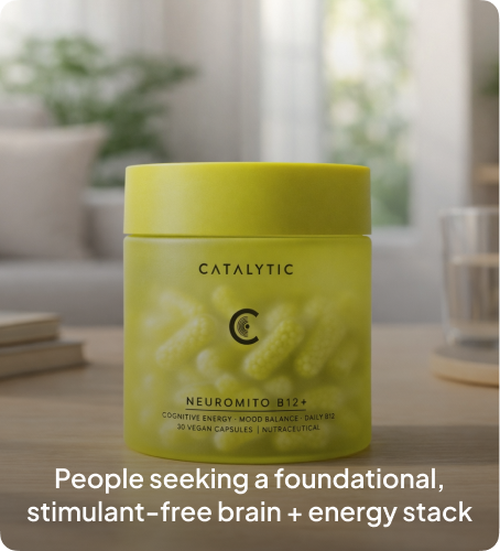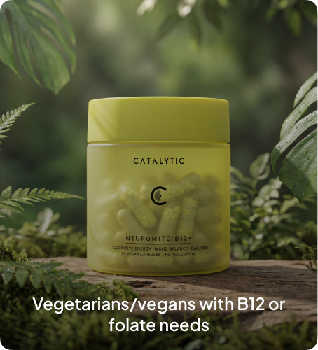 Bioactive means the nutrient is already in the form your body can immediately absorb and use—no conversions, no inefficiencies. NeuroMito B12+ uses methylcobalamin (not synthetic cyanocobalamin), active folate (Quatrefolic®), and P5P (the coenzyme form of B6), so your body doesn’t have to “work” to activate them. That’s smarter nutrition with better results.